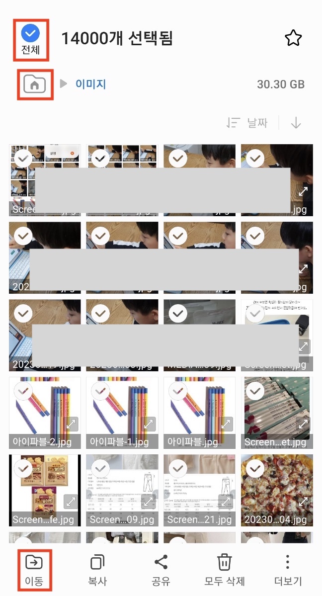전체 선택 - 화면 아래 이동 버튼 선택 - 상단 홈 폴더 선택