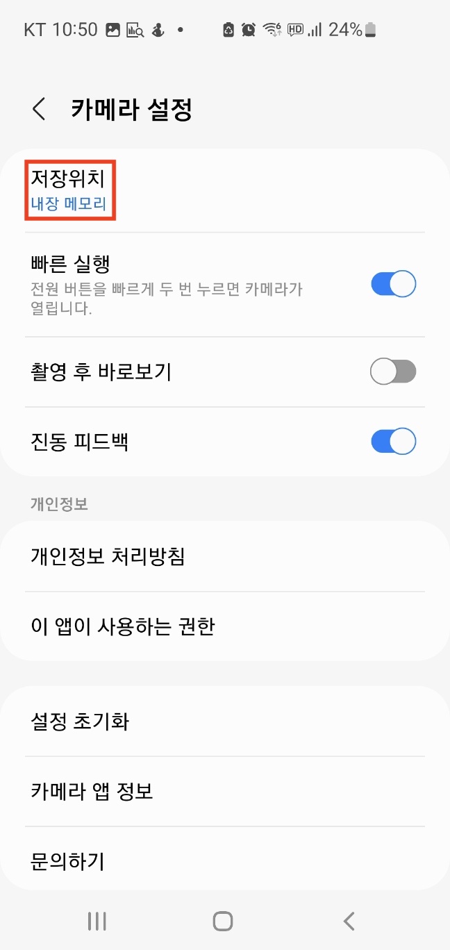 카메라로 찍는 사진들이 SD 카드에 저장되게 저장위치를 변경합니다.