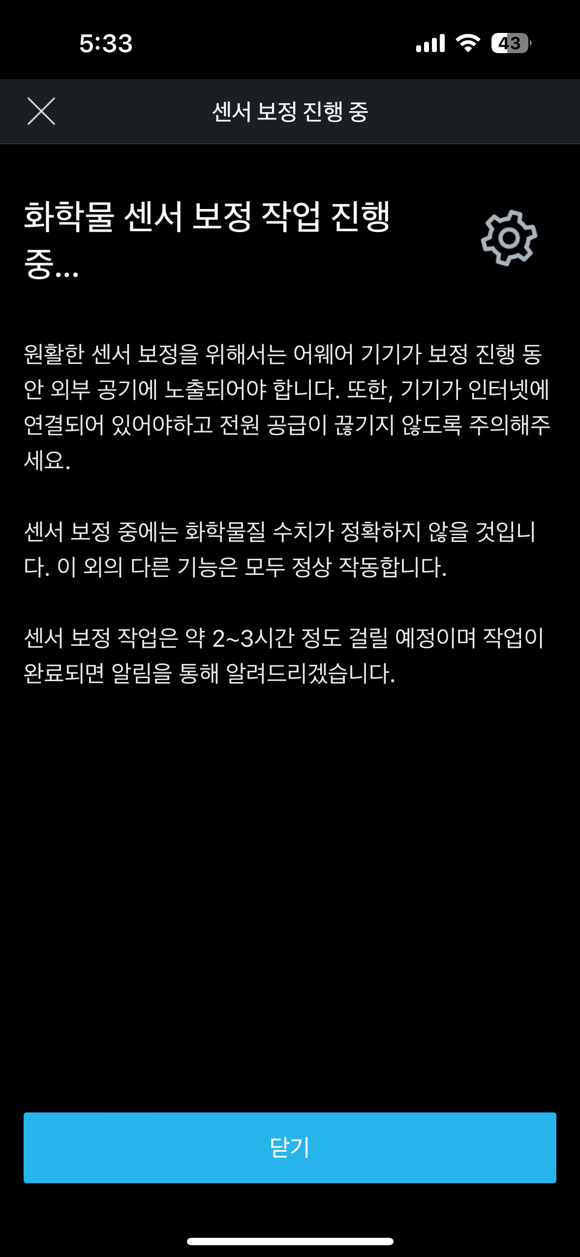 센서 보정 중 기기를 옮기지 말고 환기가 어느 정도 되는 곳에서 진행하는 게 좋다.
