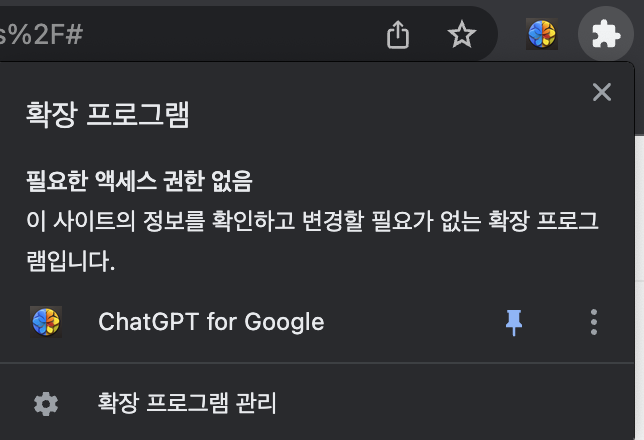 리스트에서 ChatGPT for Goole 핀 아이콘을 눌러 메뉴바에 고정시킵니다.