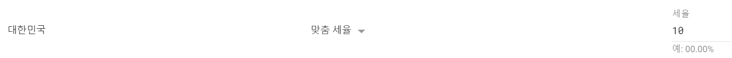 대한민국 - 세금 없음을 맞춤 세율 : 10.00 으로 입력 후 하단 저장 버튼 클릭