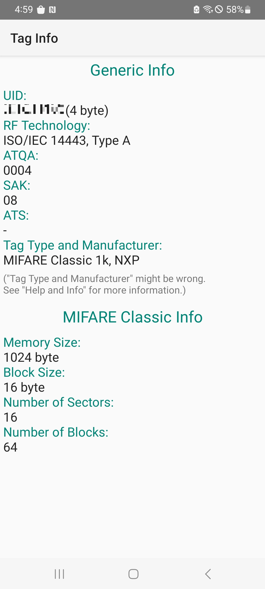 READ TAG를 누르고 스마트폰 뒷면에 현관 키를 가져다 대면 삐빅 하고 태그가 읽어지고 화면에 정보가 표시된다.