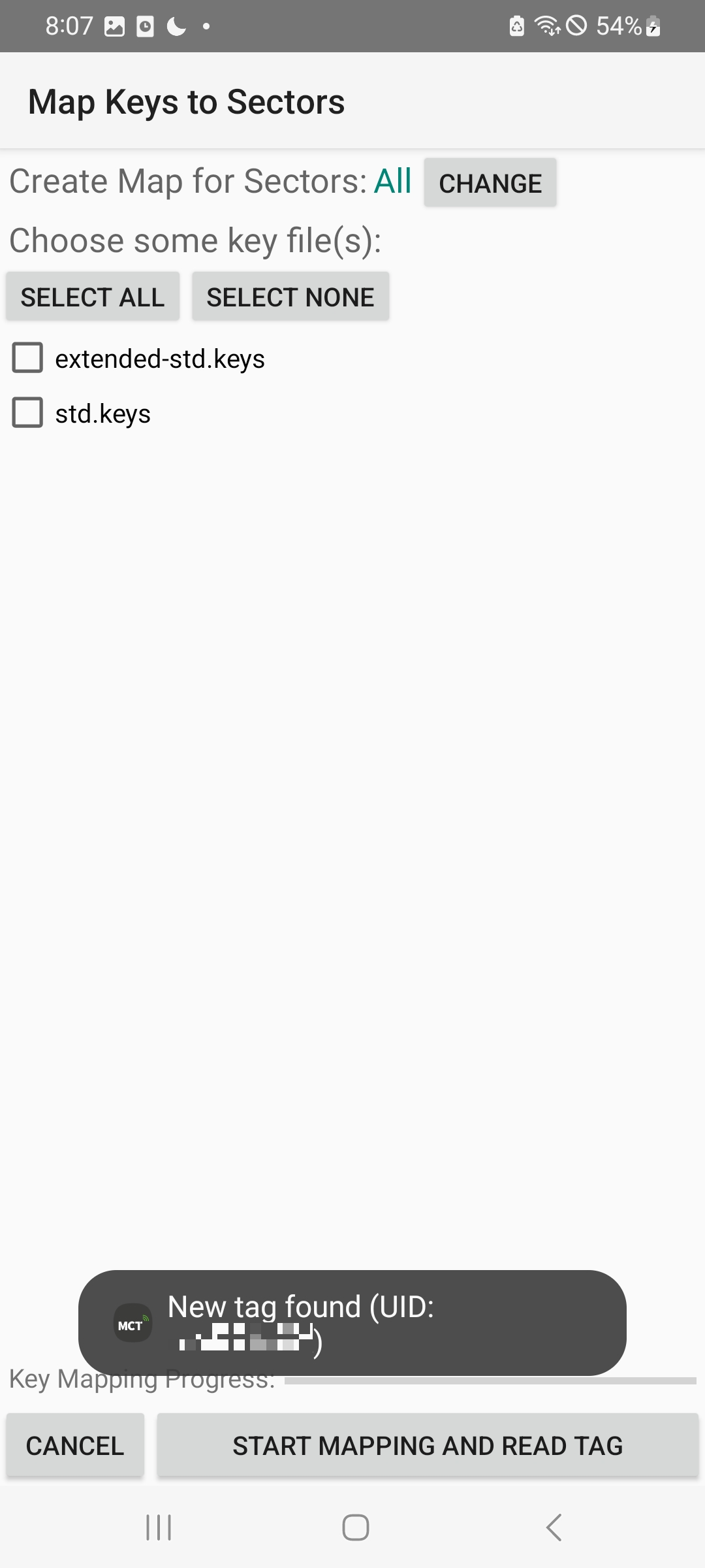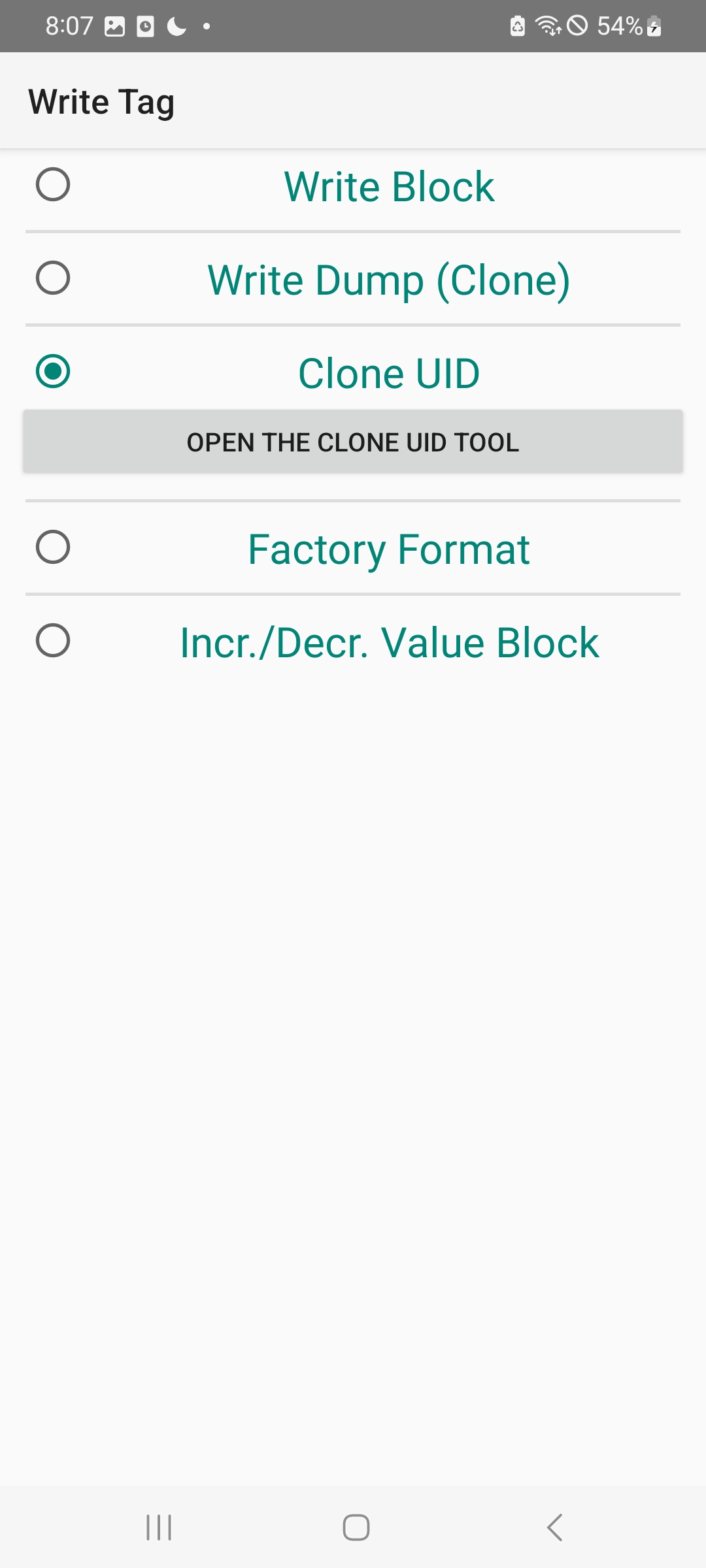 MIFARE Classic Tool 앱 화면에서 WRITE TAG를 누르고