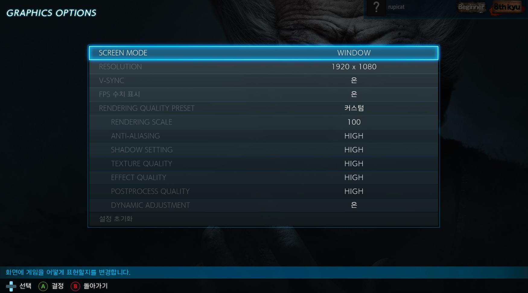 4K 모니터를 사용하지만 UHD(3840 x 2160) 해상도로 플레이 시 10 fps 정도로 프레임 드롭이 심해서 1920 x 1080 정도로 낮추면 플레이할 만한 수준이 됩니다.