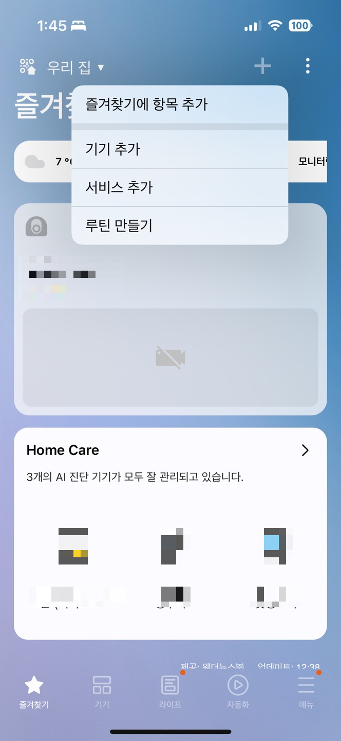 스싱 앱에서 기기 추가 - 주변기기검색(혹은 제휴사 기기)을 눌러 센서 등을 등록해 준다.
