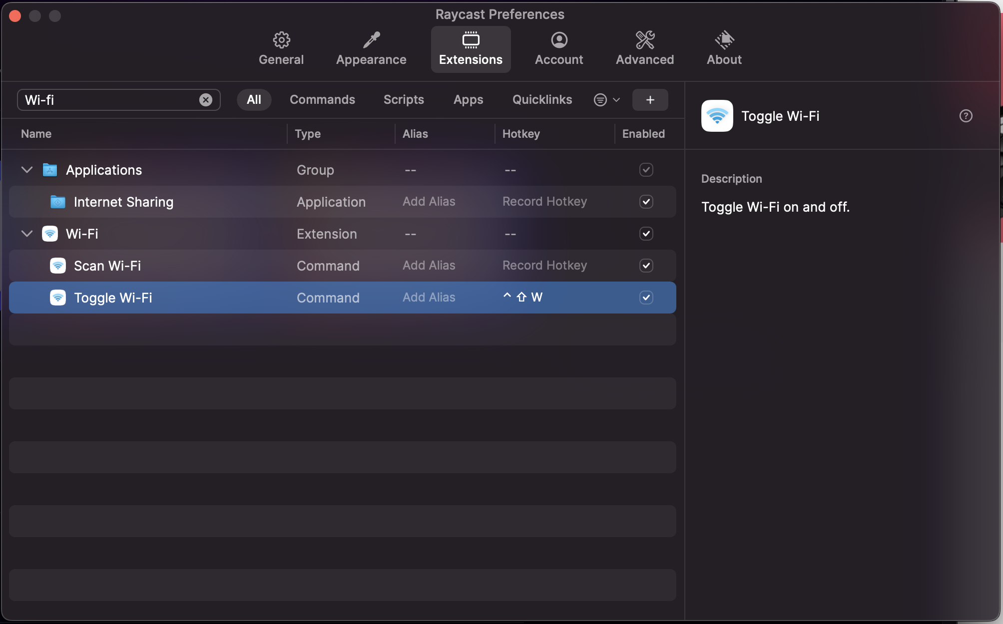 ^ + shift + W 를 단축키로 등록해서 키보드만으로 Wi-Fi를 끄고 켤 수 있습니다.