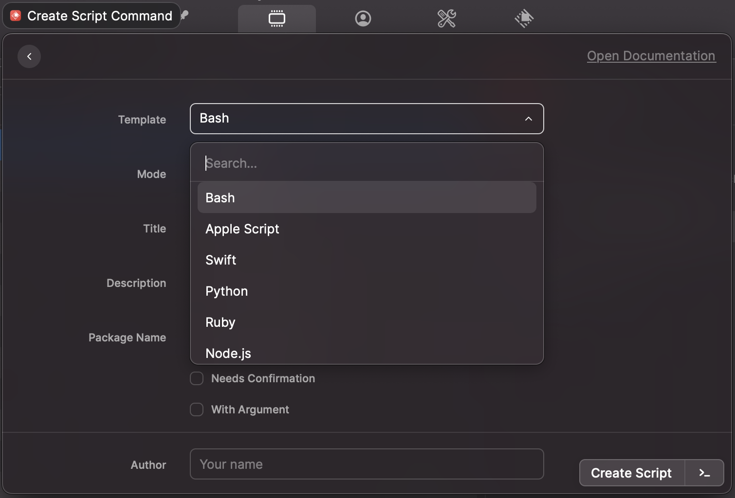 현재 지원 스크립트 언어는 Bash, Apple Script, Swift, Python, Ruby, Node.js 입니다.