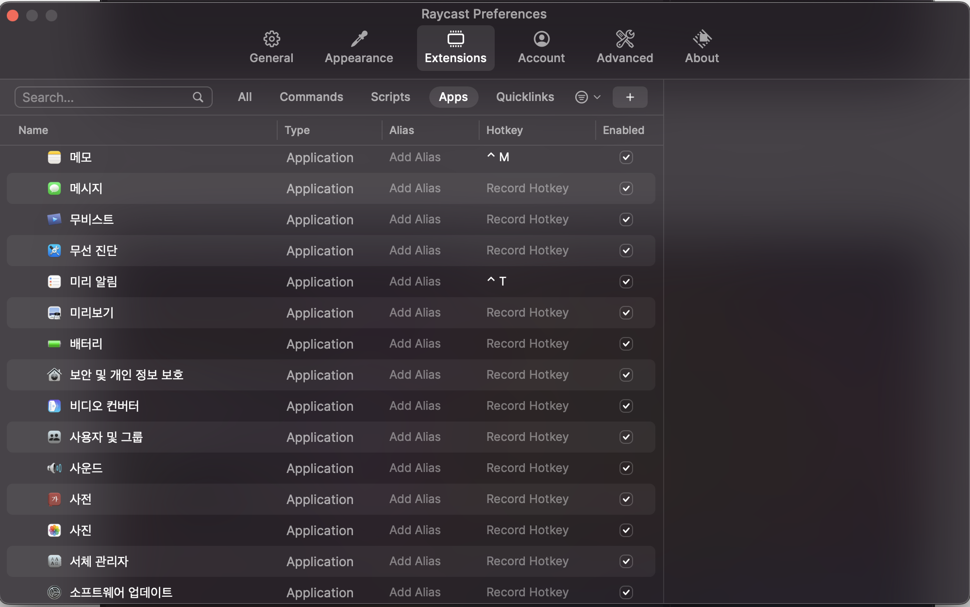 자주 사용하는 앱들을 실행 시키는 단축키를 등록해줍니다. 메모 앱은 ^ + M 등으로