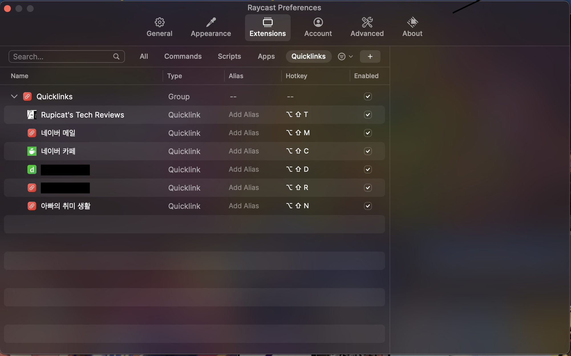 - 퀵링크(Quicklinks): URL을 등록하여 단축키 또는 Alias(단축어 타이핑)으로 해당 URL로 브라우저 탭 실행