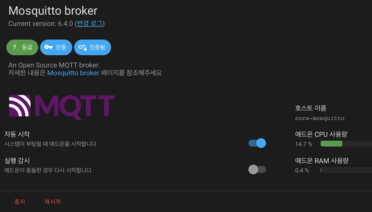 설정 - 애드온에서 mqtt 검색해서 Mosquitto broker를 설치해본다.