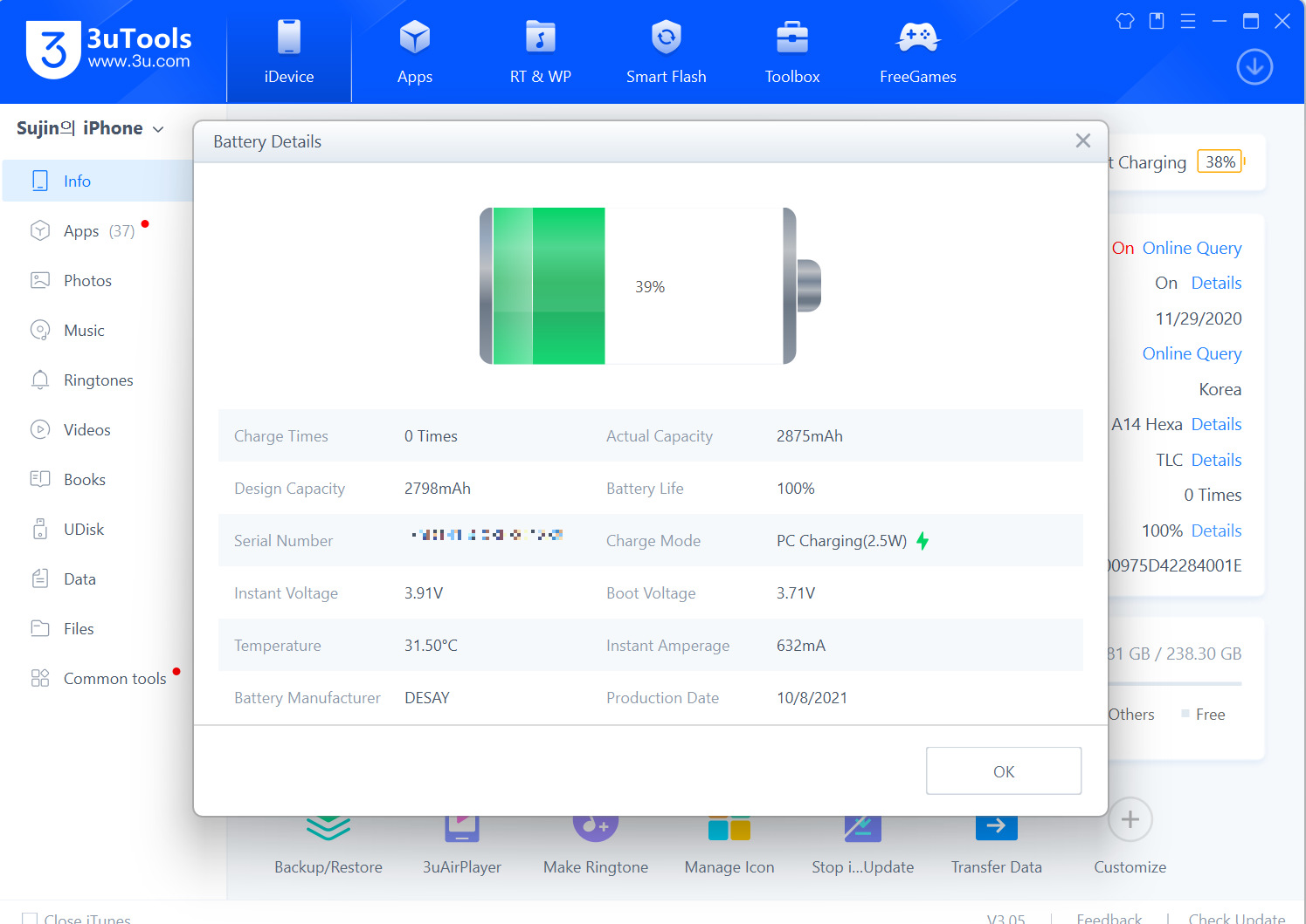 3uTools라는 프로그램을 윈도우나 맥에 설치하여 배터리 상태 확인이 가능하다.