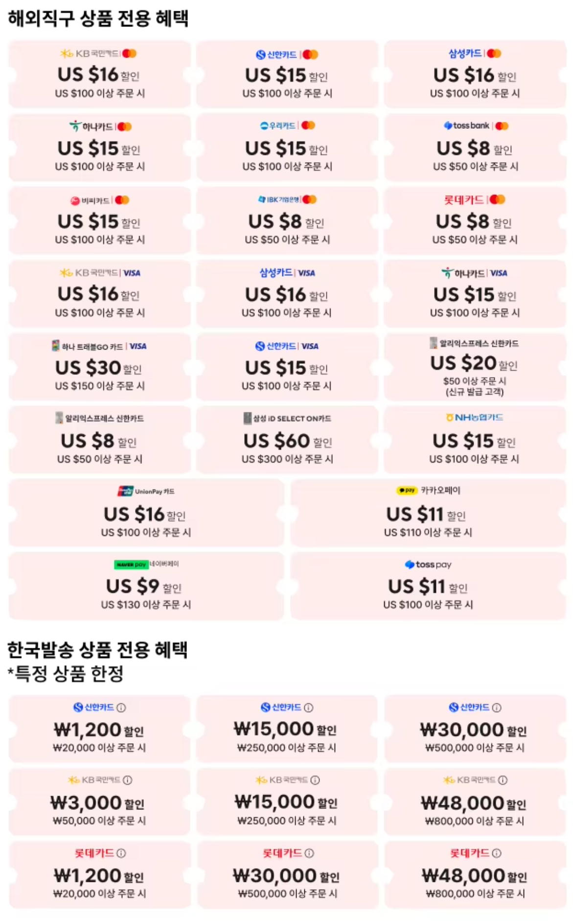 프로모션 코드 및 쿠폰이 적용 되지 않으면 아래 같은 금액대의 다른 코드를 적용해 보세요. (코드 추가 업데이트)