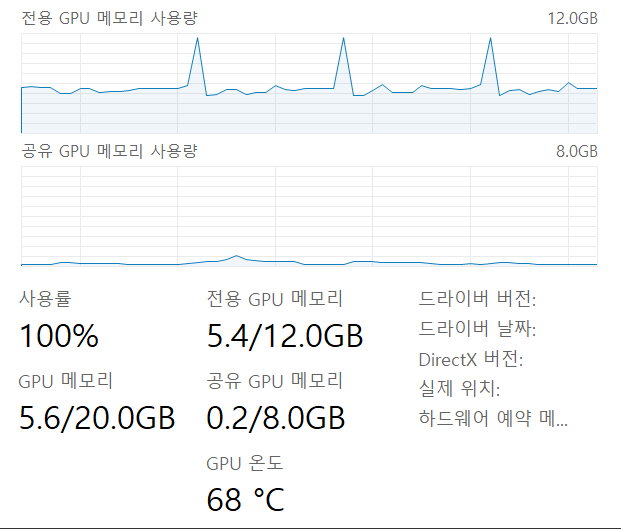 위 수치는 Stable Diffusion 엔비디아 그래픽카드 세팅을 마친 후 결과임.