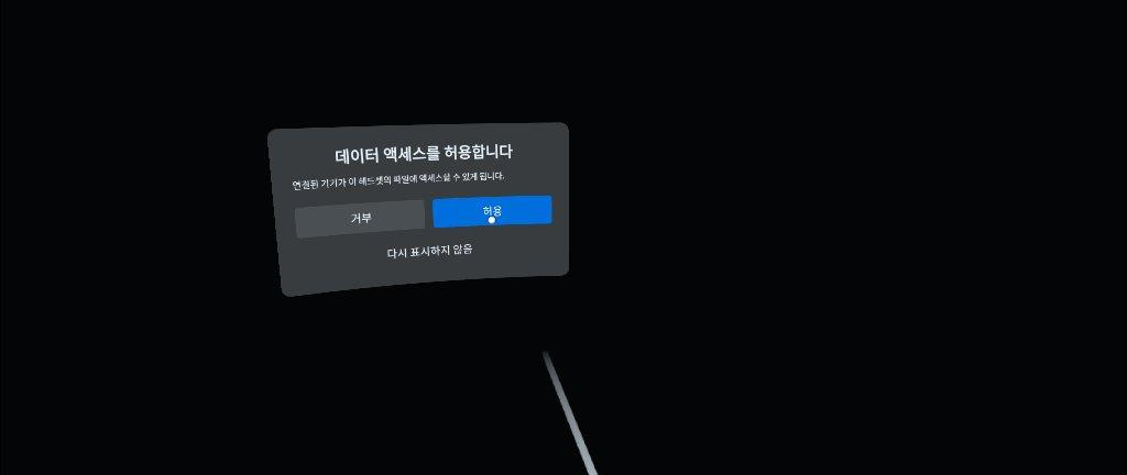 USB C 케이블을 오큘러스 퀘스트 2와 PC에 연결하고 오큘러스 퀘스트 2 헤드셋을 쓰면 연동된 기기가 데이터 액세스를 할 수 있게 허용할지 묻는 창이 뜹니다.