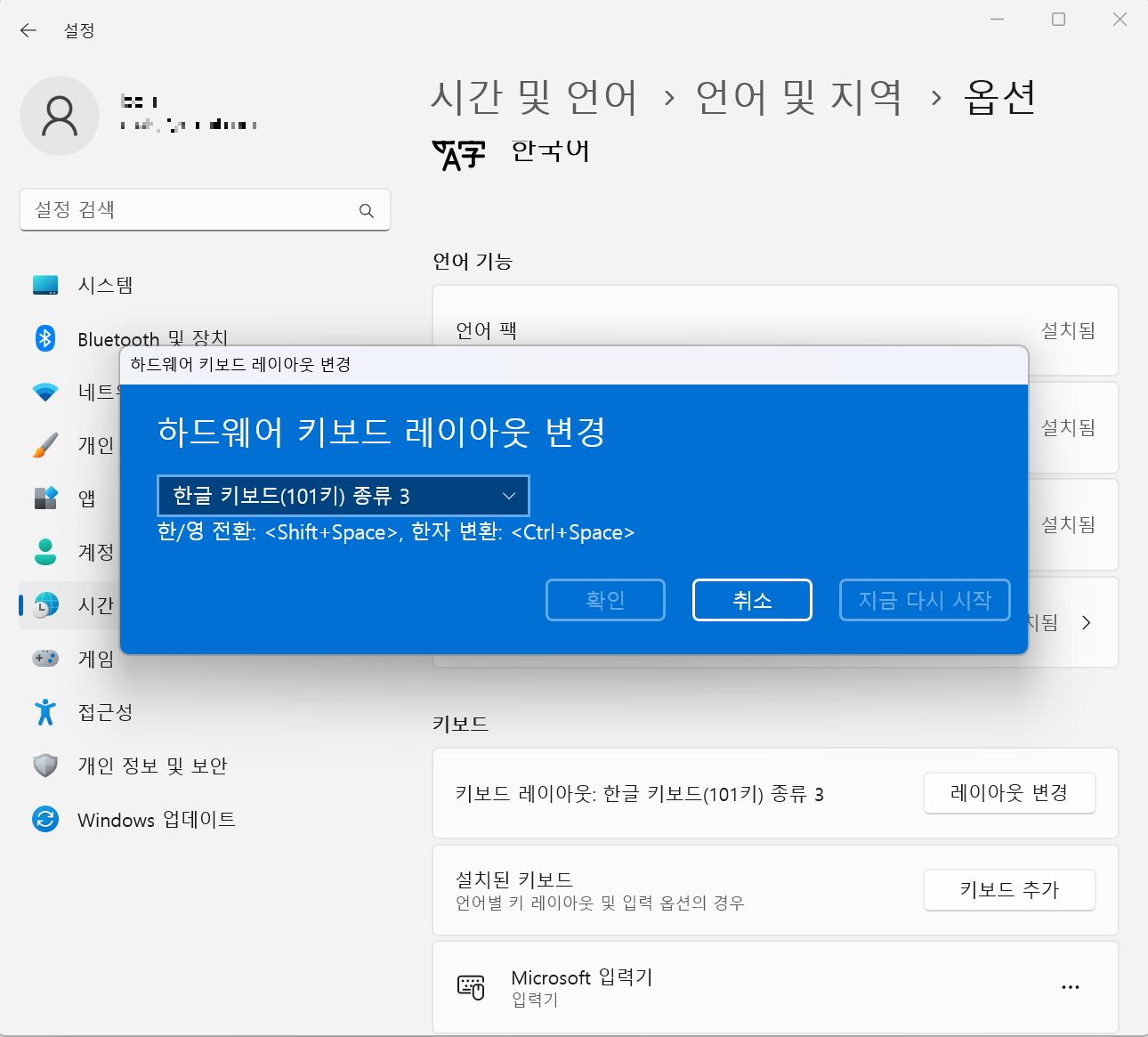 하드웨어 키보드 레이아웃 변경에서 키보드 종류 선택 후 지금 다시 시작 선택