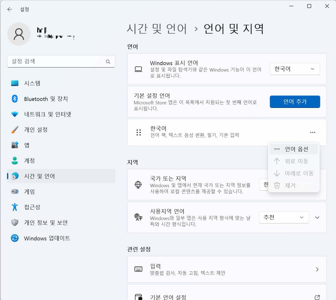 설정 - 시간 및 언어 - 언어 및 지역 - 한국어에서 ...언어옵션 선택