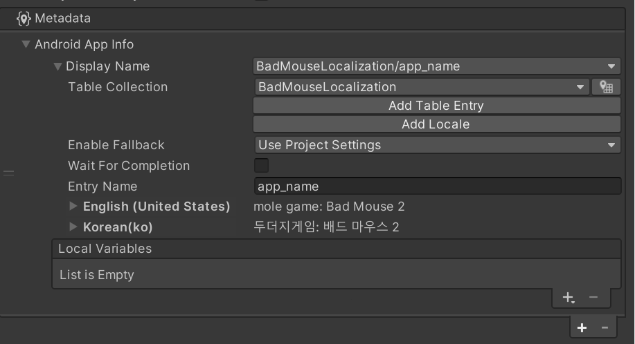 인스펙터 창의 Avaliable Locales에서 추가된 언어 확인