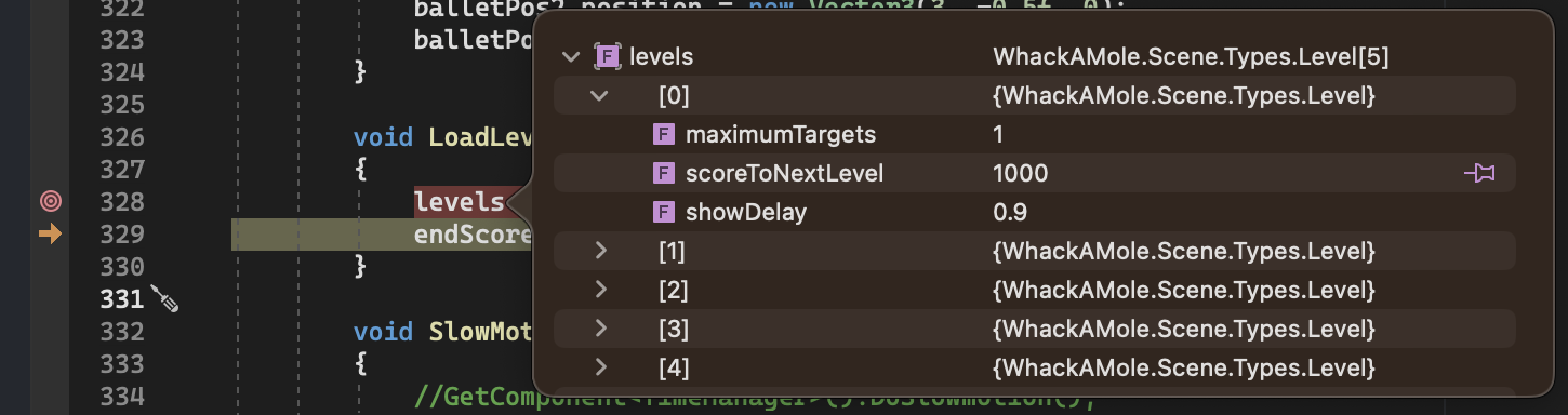 게임이 멈추고 비주얼 스튜디오에서 해당 라인 포함 이전 라인들의 변수 값들을 확인할 수 있다.