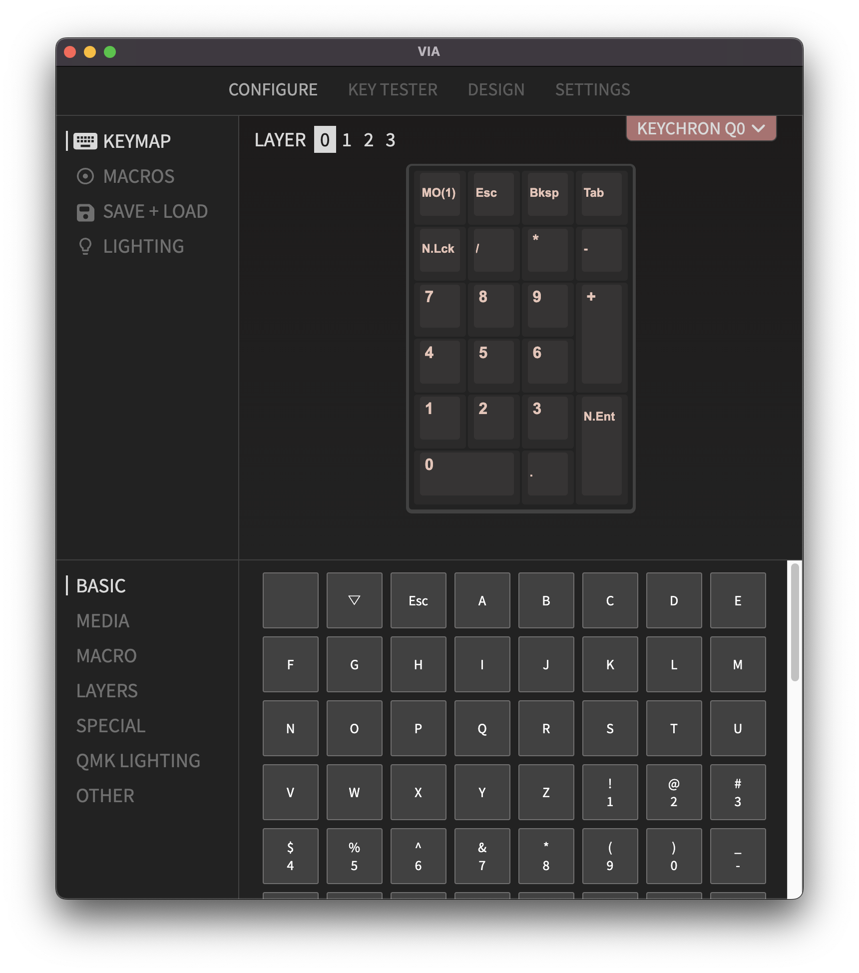 키매핑은 KEYMAP 메뉴 선택 후 키패드 이미지의 키를 마우스로 선택하고 아래 메뉴의BASIC, MEDIA, MACRO, LAYERS, SPECIAL, GMK LIGHTING, OTHER에서 원하는 키 값을 선택하면 됩니다.