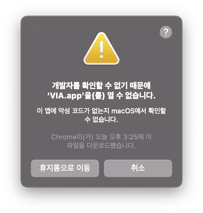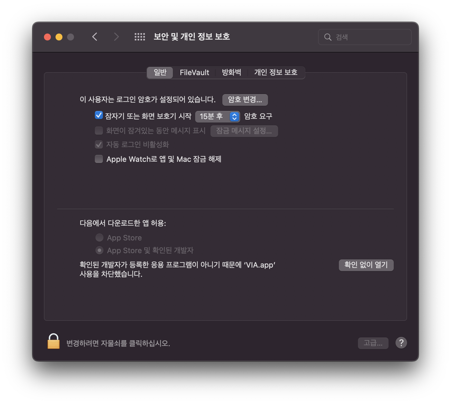 맥의 경우 앱을 열 수 없다는 경고가 뜨면 시스템 환경 설정 - 보안 및 개인 정보 보호에서 아래 자물쇠를 열고 VIA.app에 대해 확인 없이 열기 버튼을 눌러줍니다.