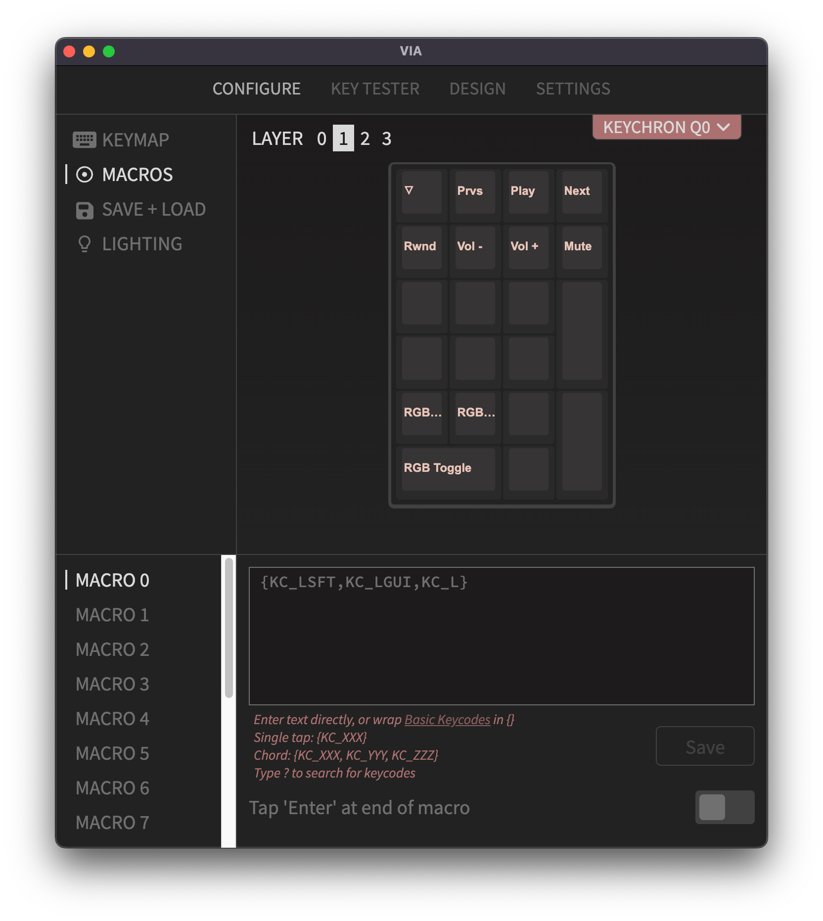 KEYMAP에서 M0(MACRO0) 값을 매핑할 수 있습니다.
