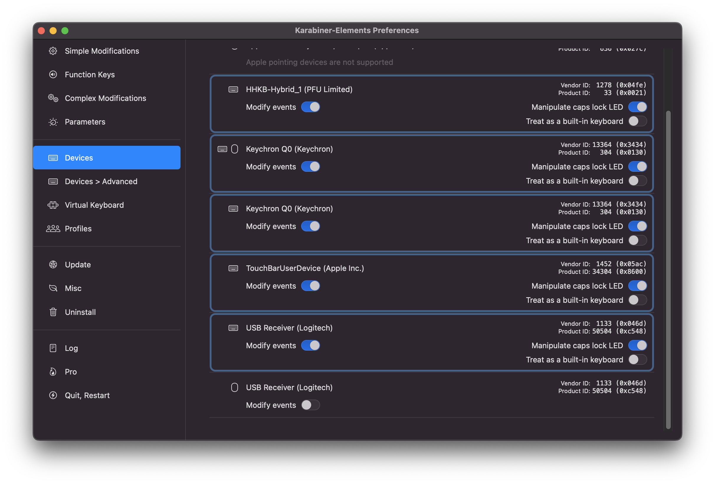 Devices 메뉴로 가서 Keychron Q0 (Keychron) Modify events 버튼 on