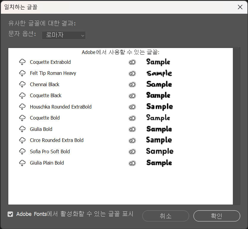 단 검색되는 폰트는 어도비에서 제공하는 폰트이다.