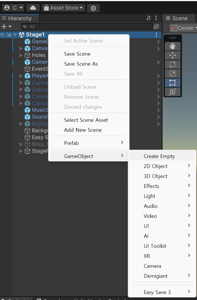 해당 scene에 새로운 빈 GameObject를 추가, 삭제하고 저장하여(scene 파일의 참조들 갱신)