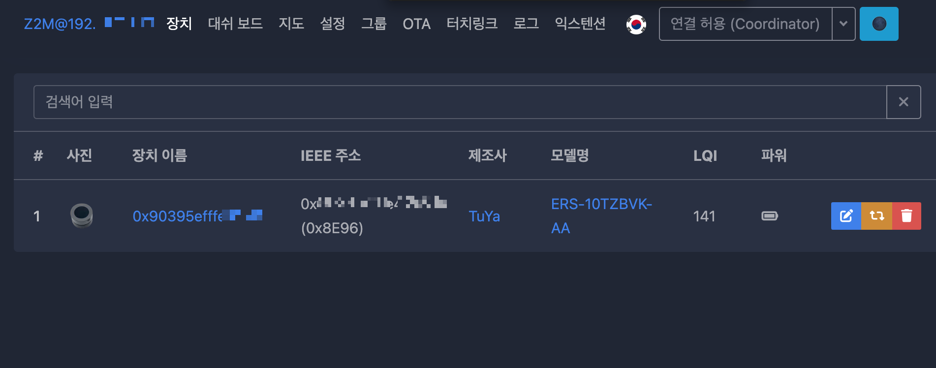 테스트로 장치 하나 추가(국기 옆 연결 허용 클릭 후 지그비 장치를 페어링 상태로 만들면 등록된다.)