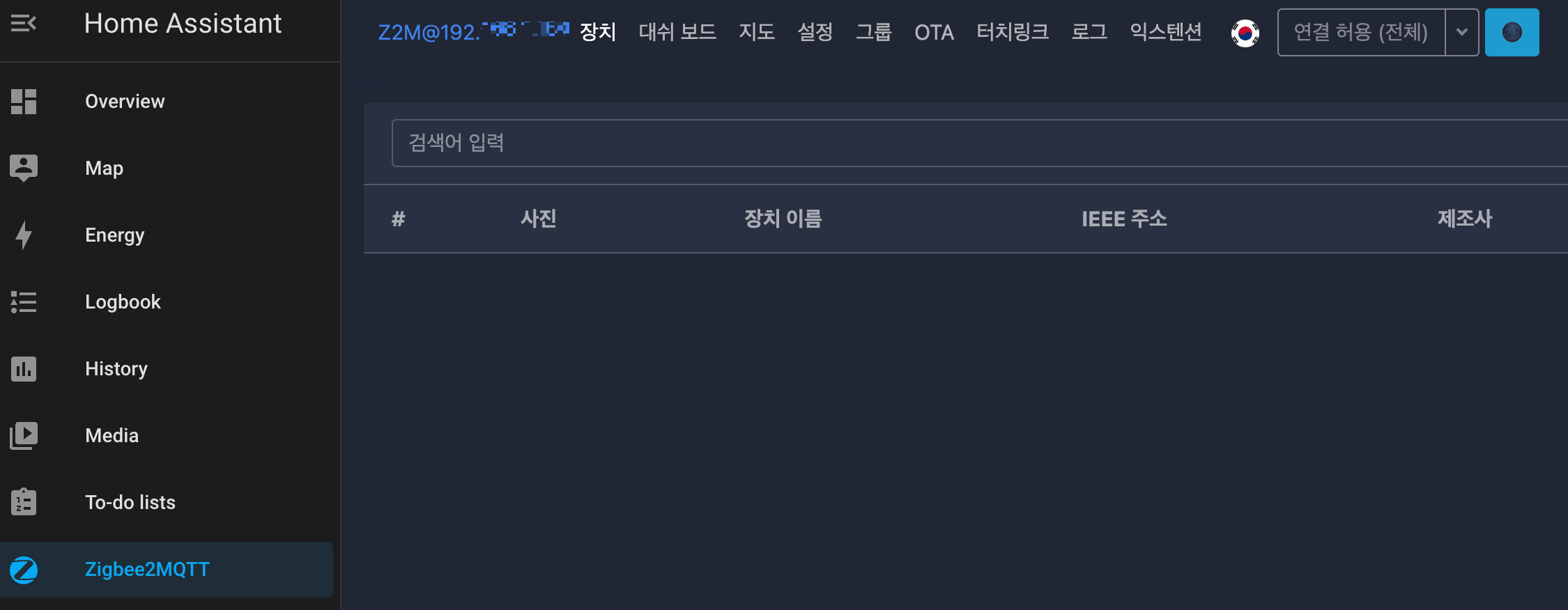 테스트로 장치 하나 추가(국기 옆 연결 허용 클릭 후 지그비 장치를 페어링 상태로 만들면 등록된다.)