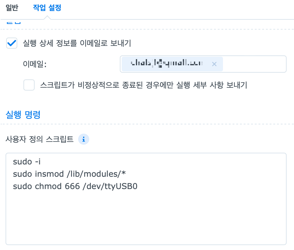 NAS DSM 화면에서 제어판 - 작업스케줄러 - 생성 - 트리거된 작업 - 사용자 정의 스크립트