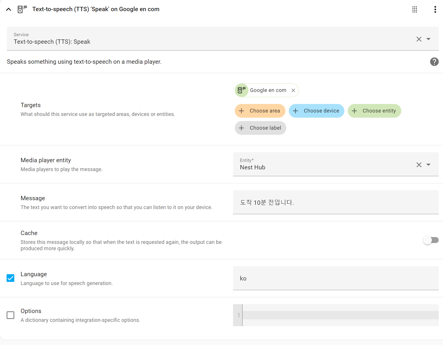 자동화 구성 시 tts 로 검색하면 ms tts를 선택할 수 있다.