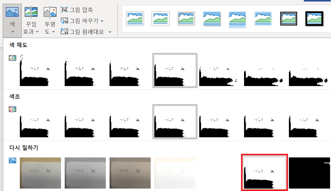 서명 이미지를 선택하고 그림서식 - 색 - 다시 칠하기 - 흑백 50% 선택