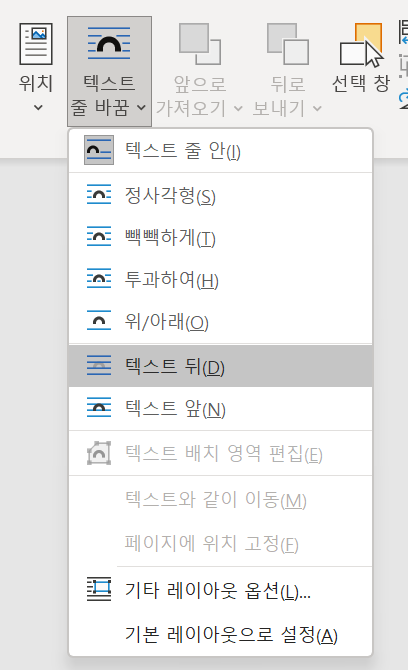 상단 메뉴 레이아웃 - 텍스트 줄 바꿈 - 텍스트 뒤 선택