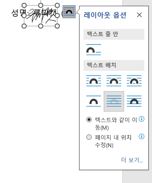 자필 서명 이미지를 원하는 텍스트 위로 이동한다.