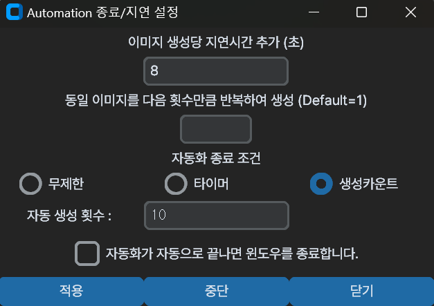자동화 생성 조건을 타이머 또는 생성카운터를 선택 후 값을 입력해 준 후 적용 버튼을 누른다.