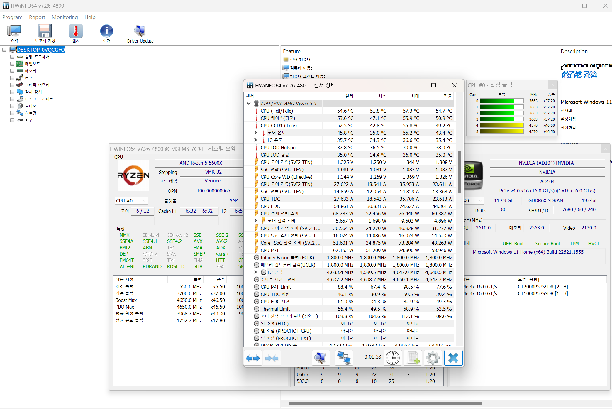 CPU, 메인보드, 메모리, 그래픽카드, 디스크, 오디오, 랜, USB 등 많은 하드웨어 정보를 확인할 수 있음.