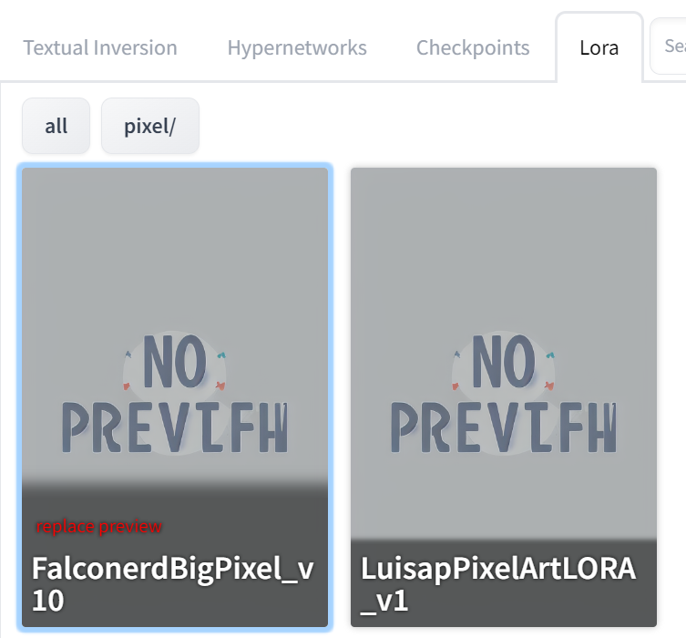 로라 목록에서 특정 로라 위로 마우스를 가져가면 replace preview 텍스트가 보이고 해당 텍스트 클릭 시