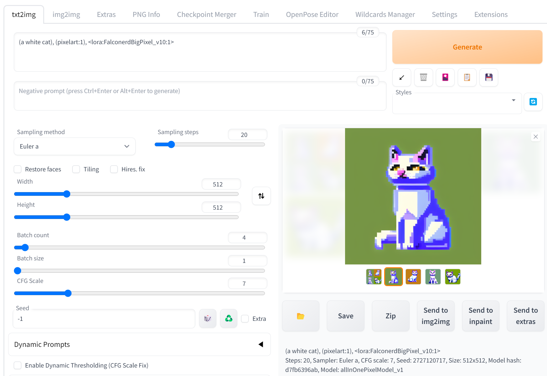 추가한 로라를 선택하면 prompt 입력란에 로라가 자동으로 입력 됨.