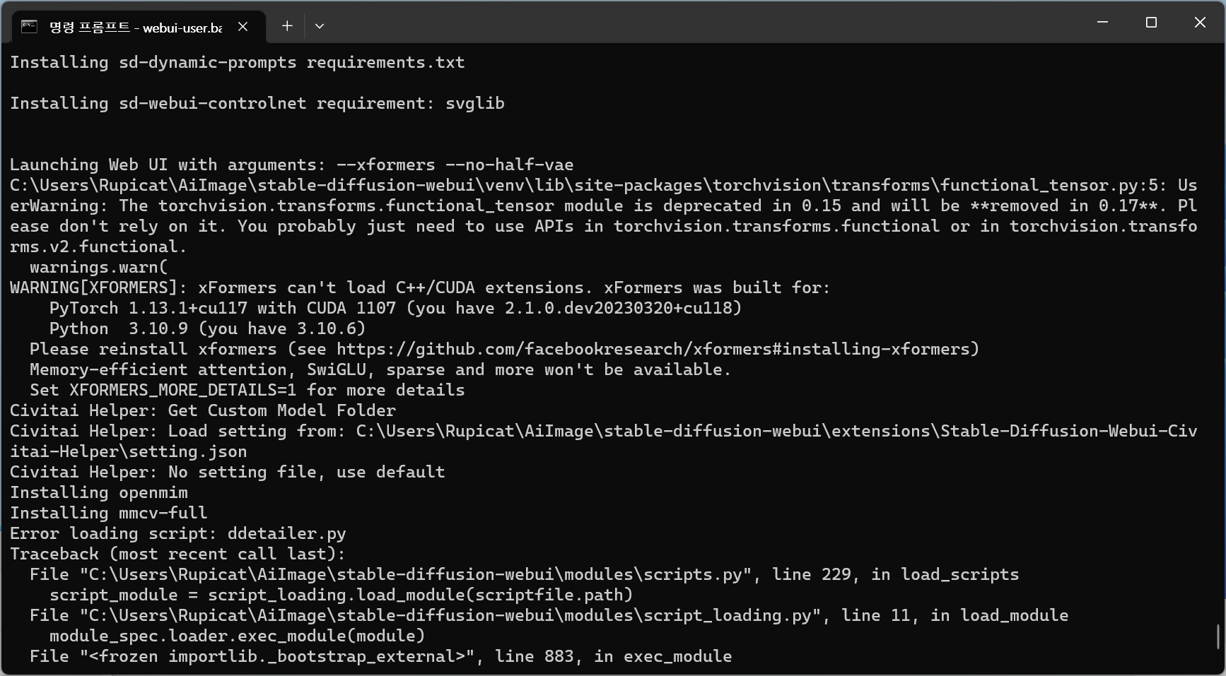 다시 파이썬 가상환경으로 이동하고 mmcv-full 설치 후 다시 webui-user.bat 실행해 볼것