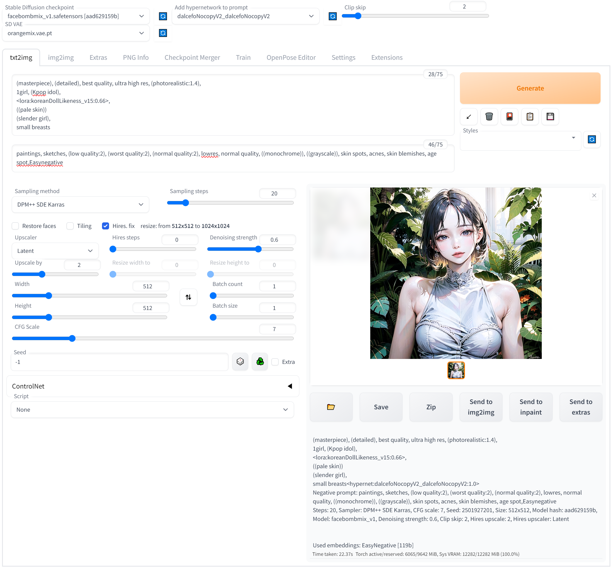 Stable Diffusion으로 AI 이미지를 생성하기 위해서는 원하는 스타일의 체크포인트(checkpoint, 모델)를 선택하고 적절한 프롬프트를 입력한 후 이미지 생성 옵션 과 업스케일 등을 설정 하고 Generate 버