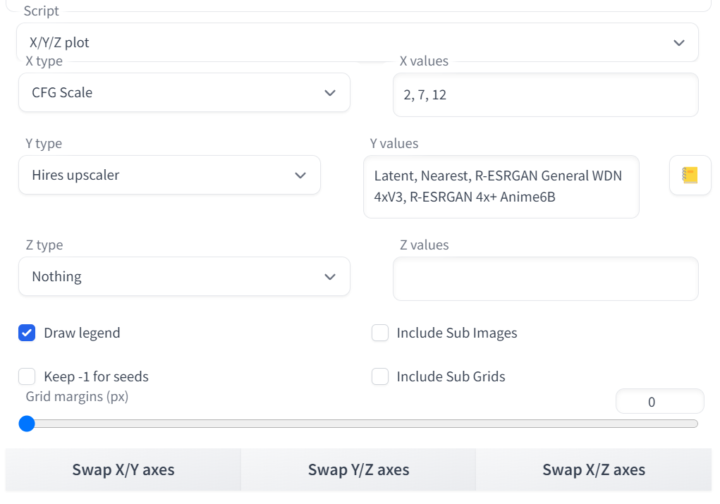 X, Y Type에 체크포인트, CFG, Hires upscaler 등 다양한 설정 항목을 선택하고 콤마(,)로 분리된 값들을 입력하면
