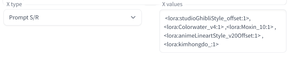 X또는 Y타입에 Prompt S/R(Search and Replace, 프롬프트 스타일 변경)을 선택하고 프롬프트 태그를 입력하면 기존 입력한 프롬프트 태그의 가중치를 변경할 수 있다.