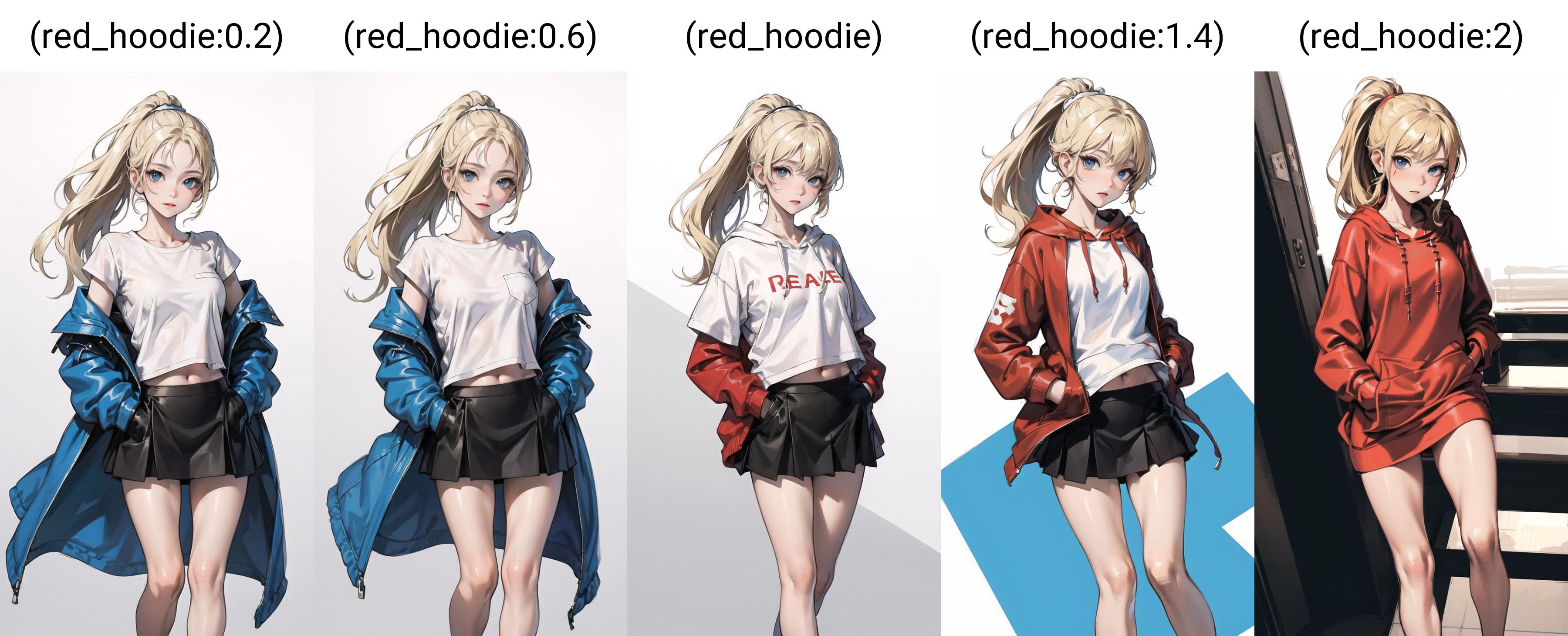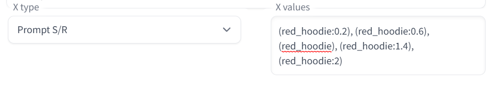 위 프롬프트 입력란에 입력된 (red_hoodie:0.2)의 가중치를 변경하려면 정확하게 (red_hoodie:0.2)를 첫번째 values 값으로 넣어준다.