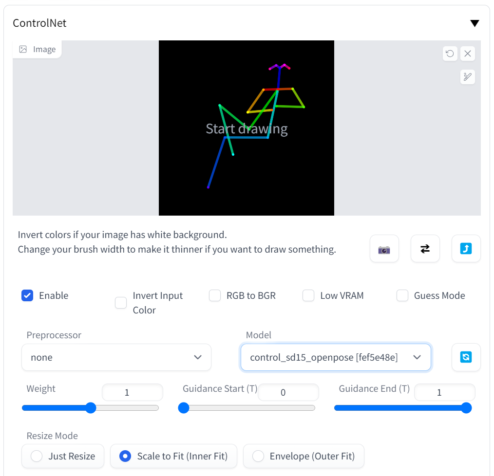 이미지를 넣으면 Preprocessor에 open pose, Model에 open pose 선택