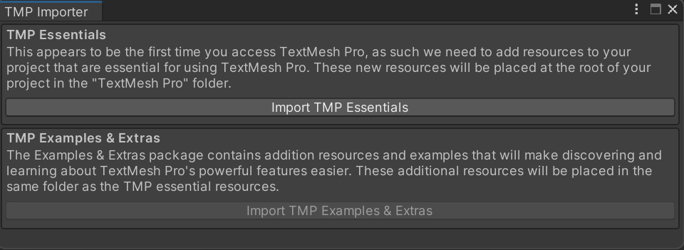 TextMeshPro를 처음 사용하면 나타나는 Import창에서 Import TMP Essentials 버튼을 누른다.