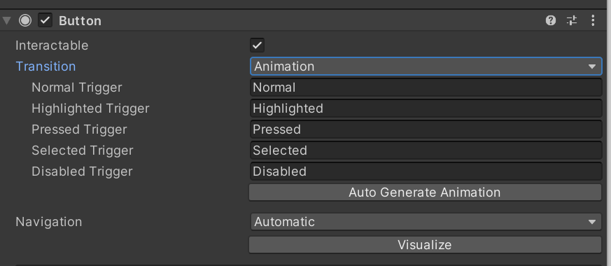 AutoGenerate Animation을 버튼을 누르면 Trigger 애니메이션들이 자동 생성된다.