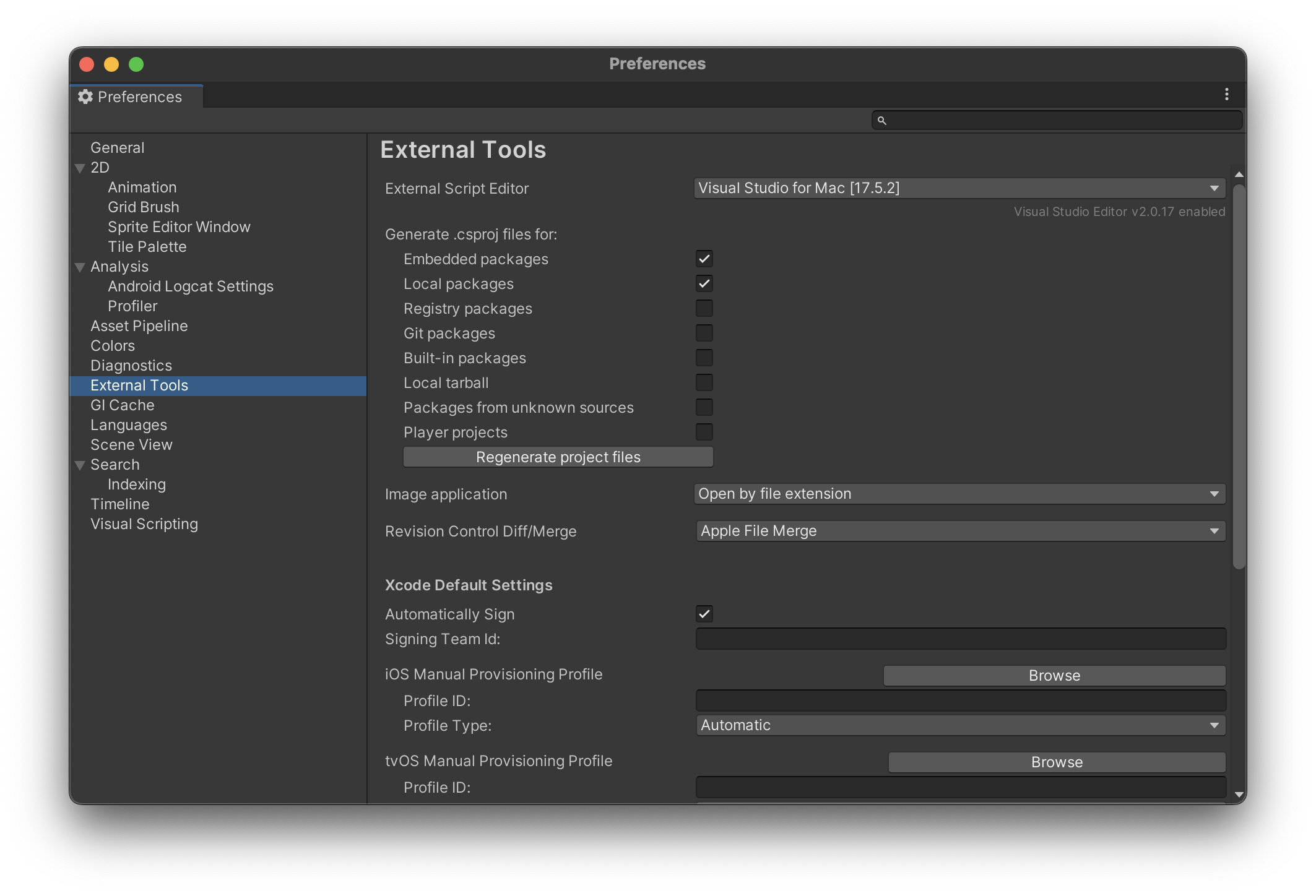 연동되었는지 확인은 유니티 Preferences - External Tools - External Script Editor 목록에서 Visial Studio가 선택되어 있는지 확인