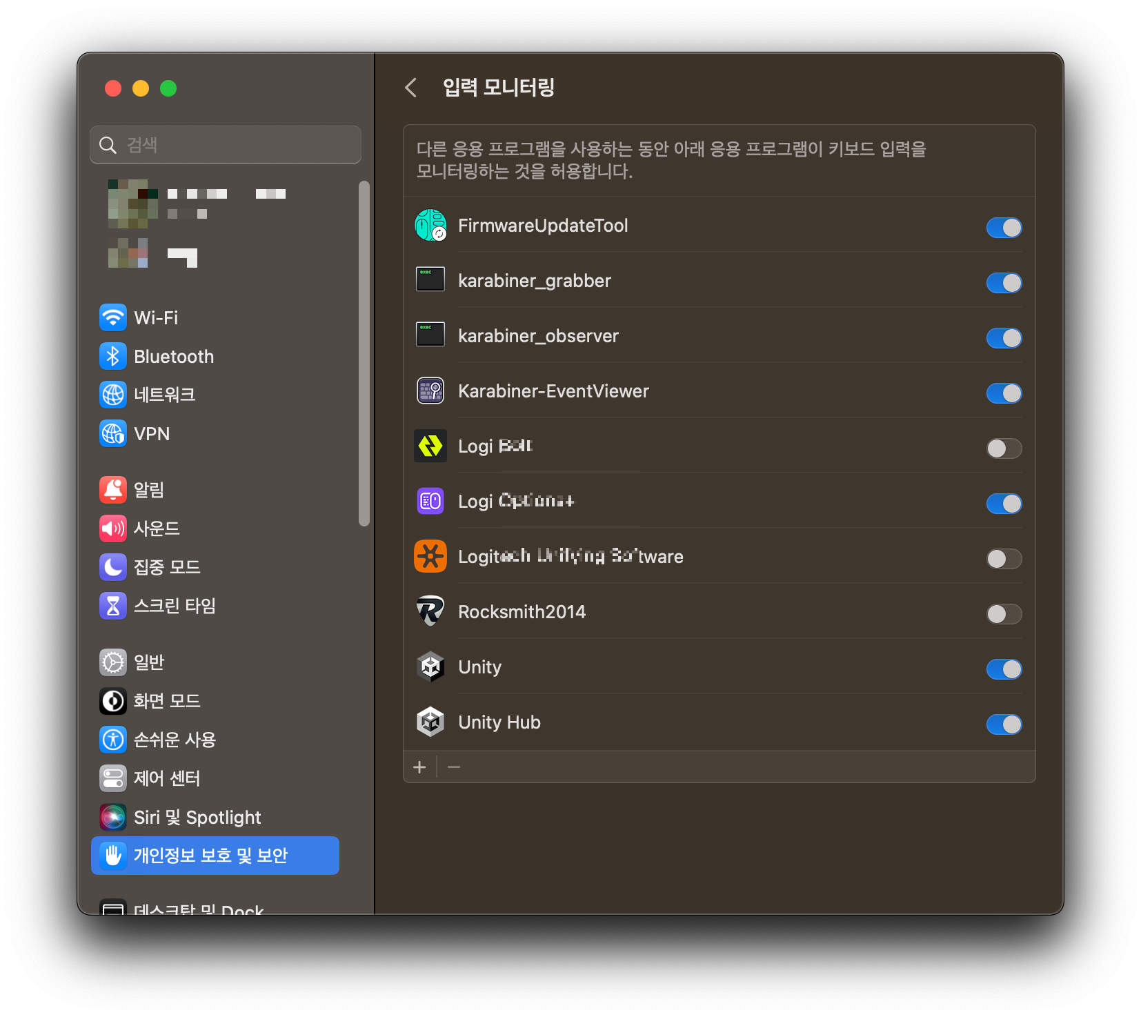 입력 모니터링에서 Unity와 Unity Hub에 대한 권한을 활성화