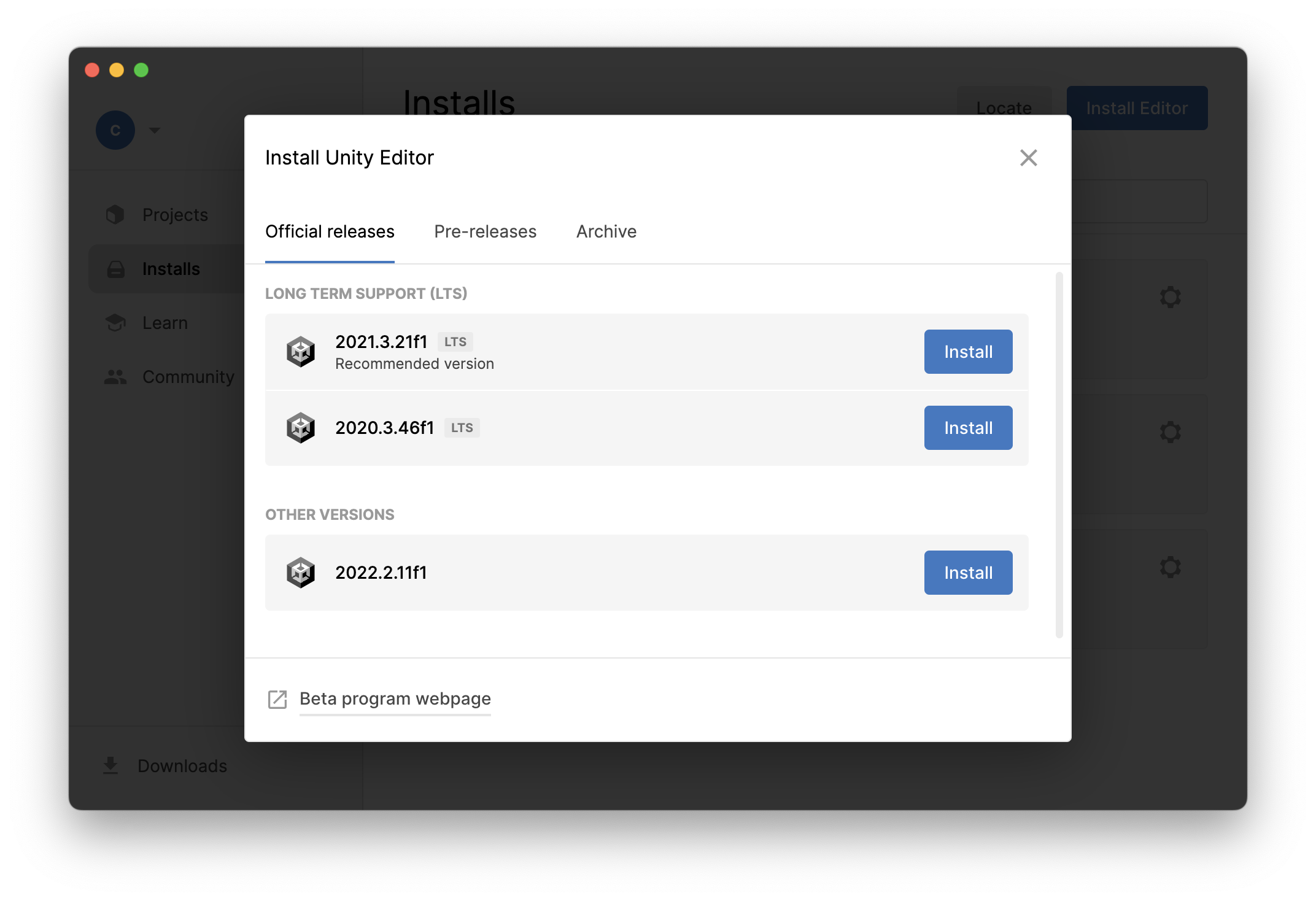 Installs - Install Editor를 선택하여 유니티를 설치한다.